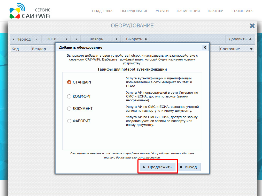 3. Выбор тарифного плана авторизации WiFi: